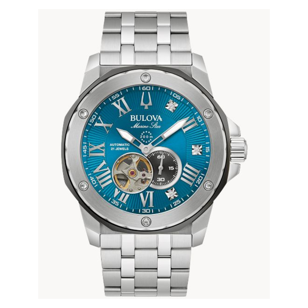 From the Marine Star Collection. Six hand calendar chronograph in stainless steel with silver-tone finish and blue dial, flat mineral glass, screw-back case, and fold-over closure with pushers, safety bar and extender.