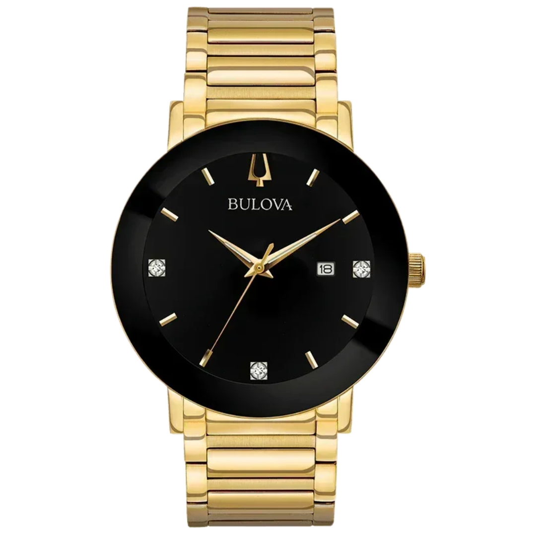 In black IP and gold-tone stainless steel with three diamonds on black dial, three-hand date feature, metalized edge-to-edge curved crystal, screw-back case, gold-tone stainless steel bracelet with deployment closure.