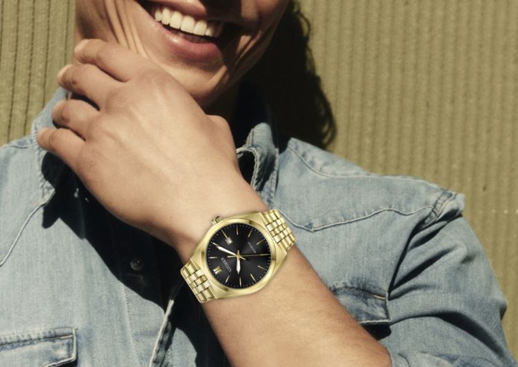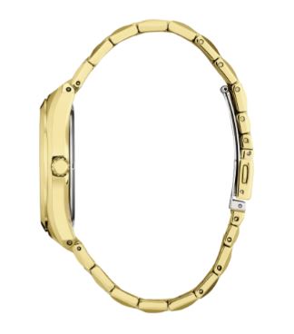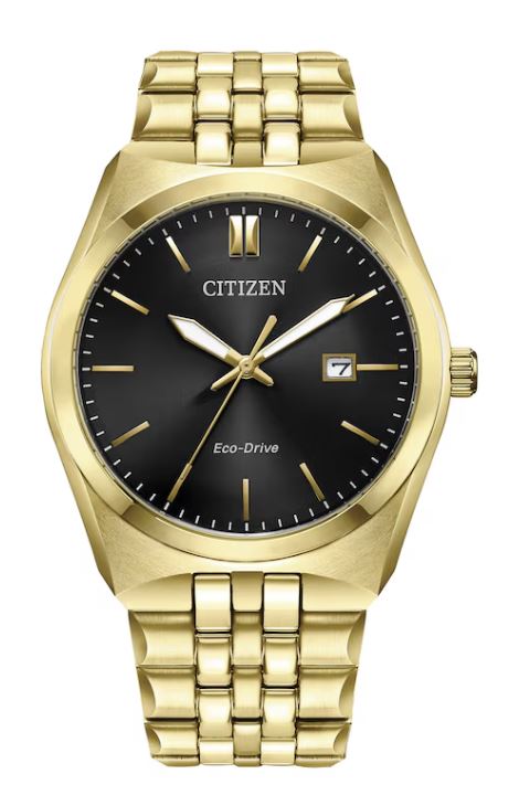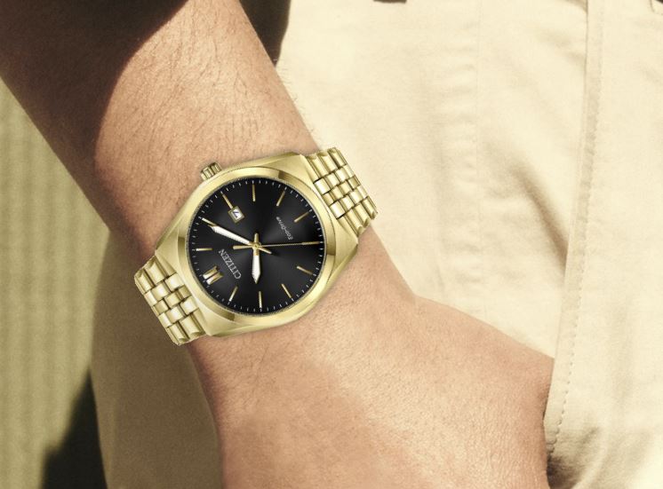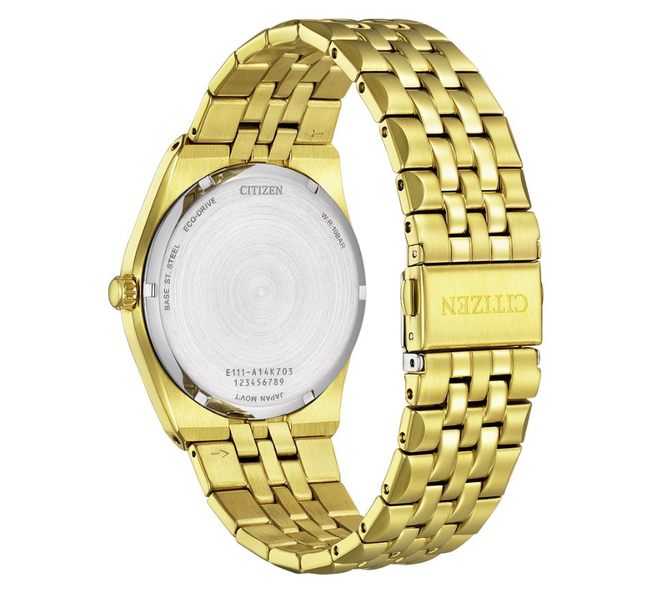 The is a sleek Eco-Drive watch features a gold plated stainless steel case and bracelet. Its black dial is protected by a mineral crystal that is impact and shatter resistant. Powered by any light source, this watch eliminates the need for battery replacements.