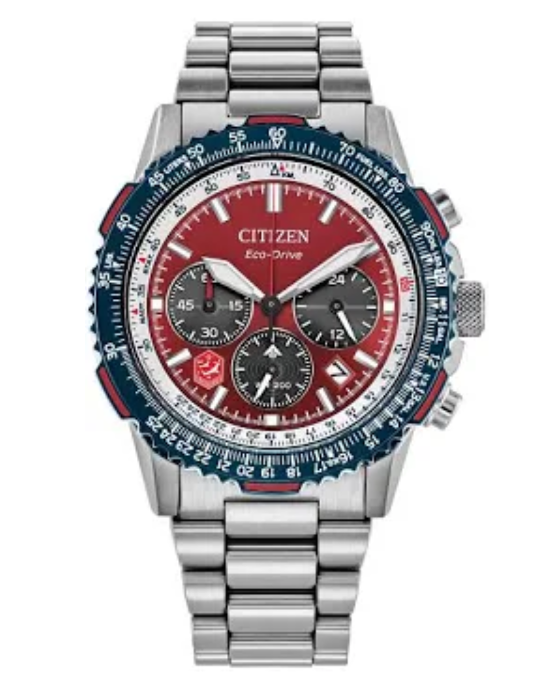 On the wrist, the timepiece's silver-tone stainless steel casing has a diameter of 40mm, making a strong statement with its distinct faceting and satin finish, while a slide-rule scale on the two-way blue and red ion-plated bezel adds extra flight functionality. The timepiece is secured by a triple-link stainless steel bracelet. The watch features a Snowbirds color scheme with black highlights on the dial, enhancing its excellent readability, while a sapphire crystal and 200m water resistance safeguard everything. Features consist of a 1/5 second chronograph that records up to 60 minutes, 12/24 hour time formats, and a date display.