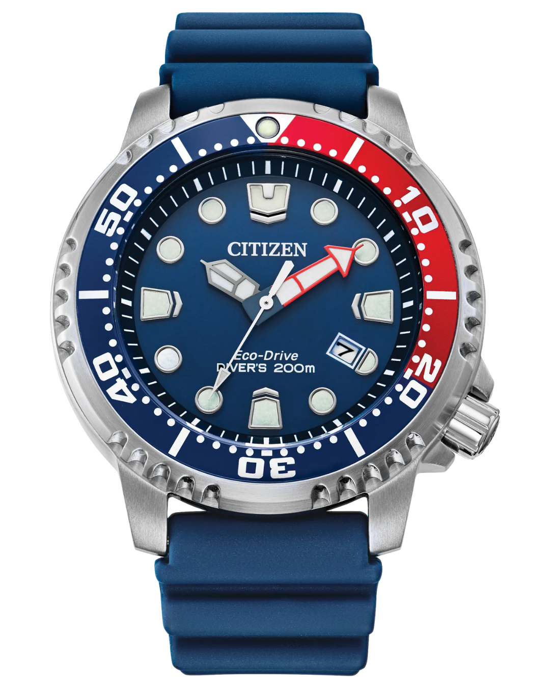 Delve into the profound realms of fashion with Citizen’s Promaster Eco-Drive Dive watch, showcasing the cherished blue and red bezel. This essential diving watch includes a silver-tone stainless steel case, a blue dial with a 3-hand movement and date, glowing hands and markers, plus red, white, and blue details. The sturdy blue, water-resistant polyurethane band enhances the appearance.