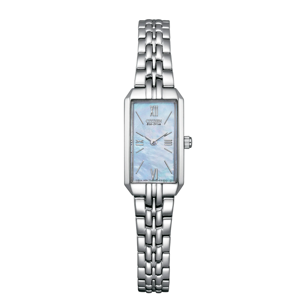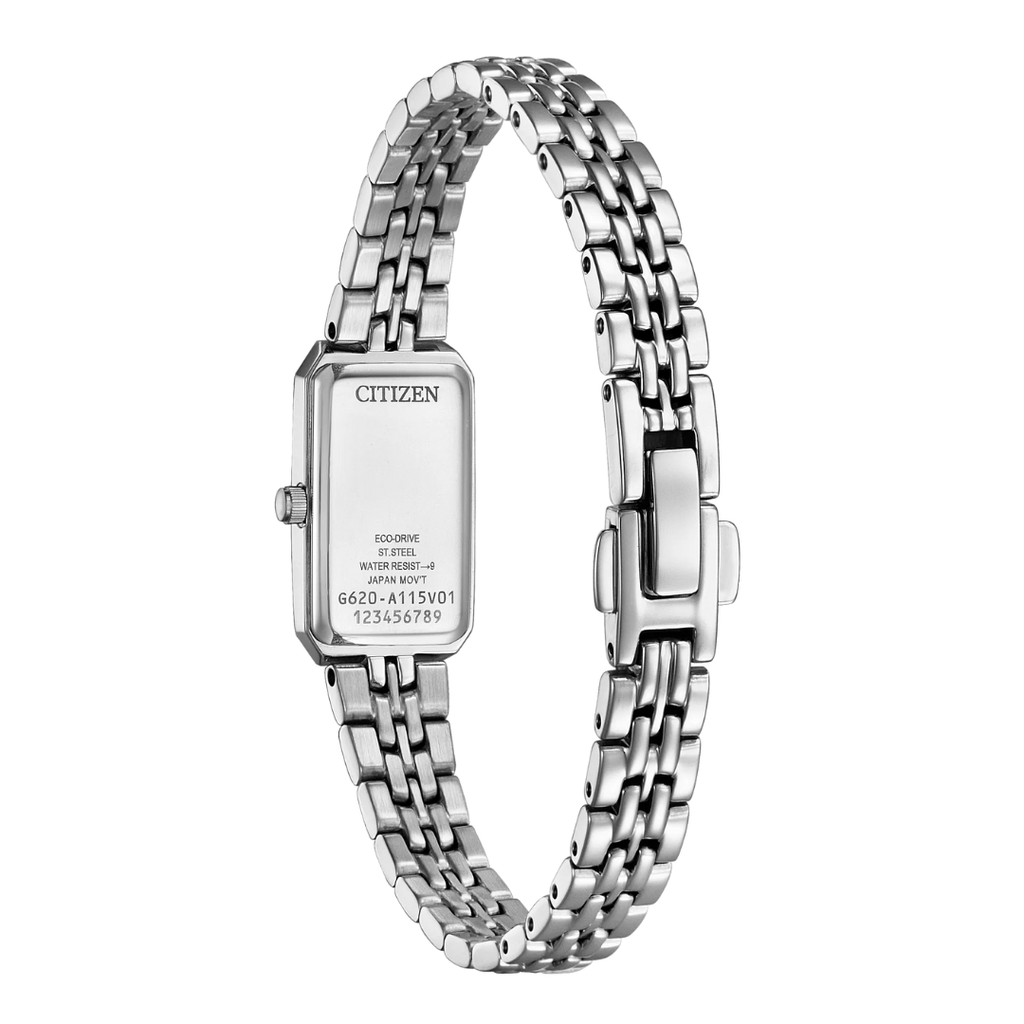 Perfectly complete any look with the elegance of this Citizen Eco-Drive Ladies' Classic. Featuring a 30.5 x14.5 mm rectangular stainless-steel case and bracelet, this elegant timepiece fits seamlessly on the wrist.