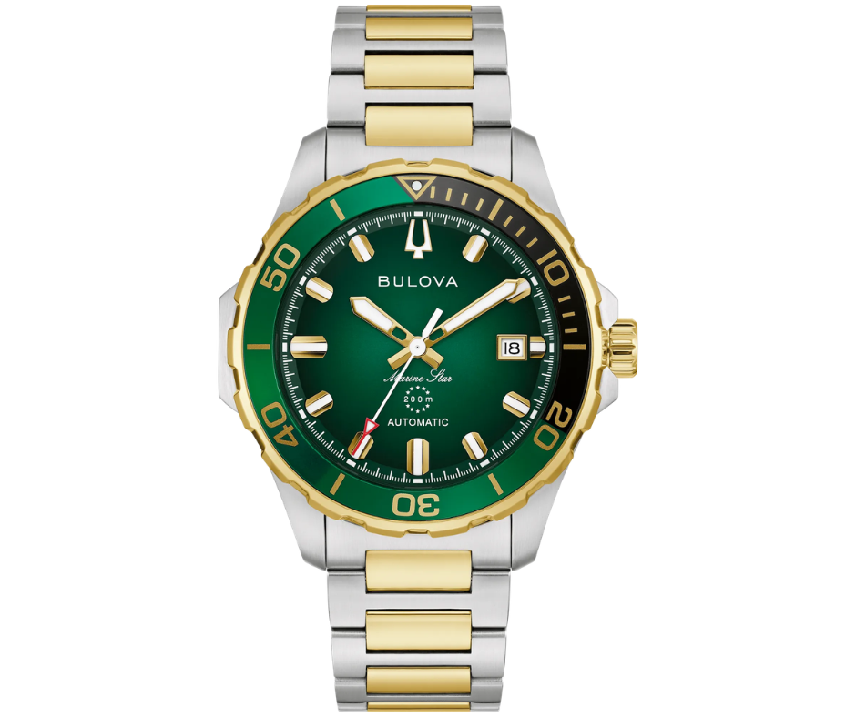 The Bulova Marine Star Series B (98B467) is an uncompromising redesign that perfectly balances rugged utility with refined style. Housed in a 41mm two-tone silver and gold-tone stainless steel case, it features a striking deep green sunray dial framed by a matching bi-colour unidirectional bezel. Built for adventure, the watch is equipped with a sapphire crystal, a screw-down crown, and 200m water resistance, ensuring durability both above and below the waves. Its automatic movement, visible through an exhibition case back, boasts a 42-hour power reserve, while the premium H-link bracelet and luminous gold-tone accents provide a bold, high-end finish suitable for any occasion.
