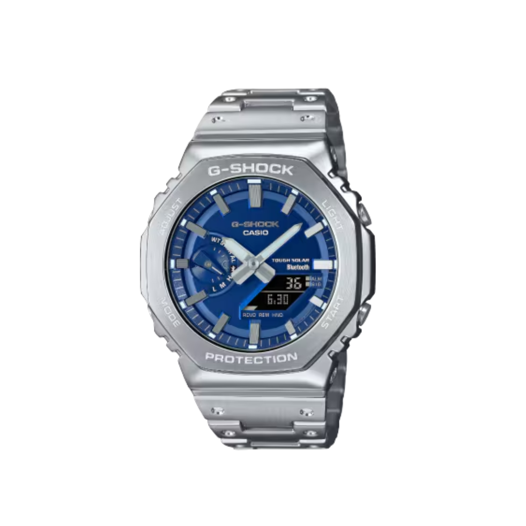 The metal band pieces are dimpled to reproduce the look of the resin band design of the very first G-SHOCK. The stainless-steel bezel is meticulously forged, cut, and polished for stunning depth and dimension. A hairline finish is applied to the bezel top and a mirror finish to the beveled edges, creating a smart metal timepiece that truly shines.