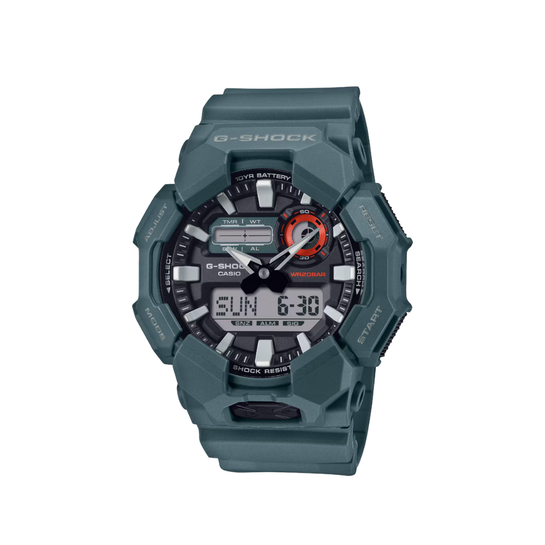 The analog-digital GA-010 delivers handy features like world time and stopwatch, as well as a high-brightness LED light, which can be easily accessed from the large button on front of the case, ensuring visibility even in the dark.