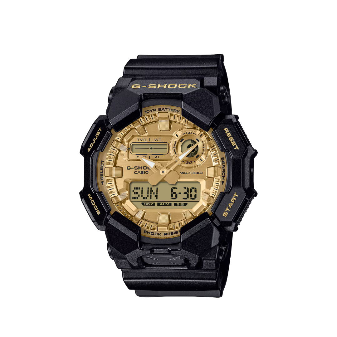 The all-black body, tough as any G-SHOCK, glitters with gold-colored accents and mirrored textures for a look that is totally bold yet utterly cool.