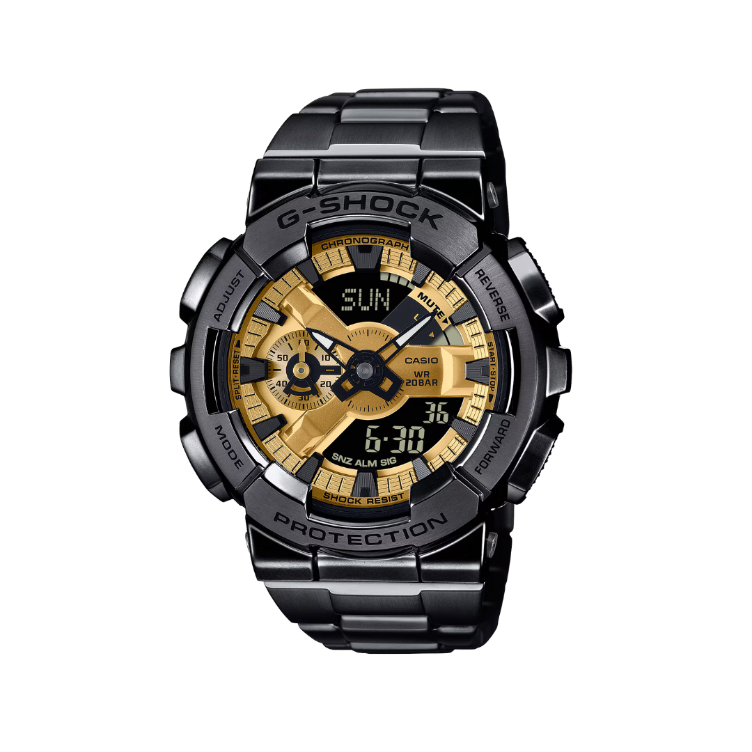 Introducing the GM-110BD, an updated take on the ever-popular large case analog-digital G-SHOCK with metal bezel and band. Precision forging, cutting, and polishing, and even special molding techniques, all go into crafting a metal bezel featuring a rugged, high-impact design, for a solid construction that sacrifices nothing in toughness. The case is made of fine resin to protect the module. With a metal band, all-black ion plating, and dial in a gold color, the GM-110BD-1A9 is up for anything — work or play.