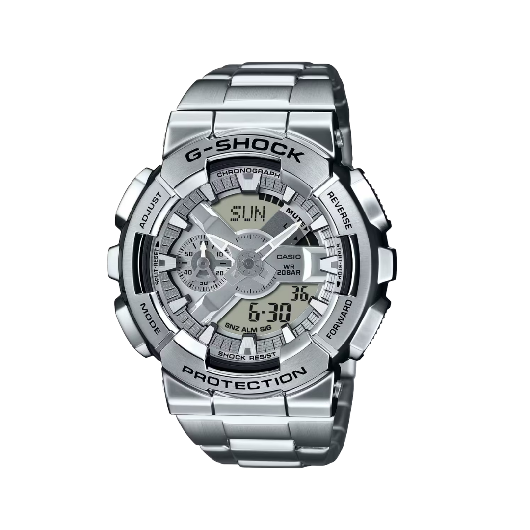 Introducing the GM-110BD, an updated take on the ever-popular large case analog-digital G-SHOCK with metal bezel and band. Precision forging, cutting, and polishing, and even special molding techniques, all go into crafting a metal bezel featuring a rugged, high-impact design, for a solid construction that sacrifices nothing in toughness. The case is made of fine resin to protect the module. With a metal band, all-black ion plating, and dial in a gold color, the GM-110BD-1A9 is up for anything work or play.