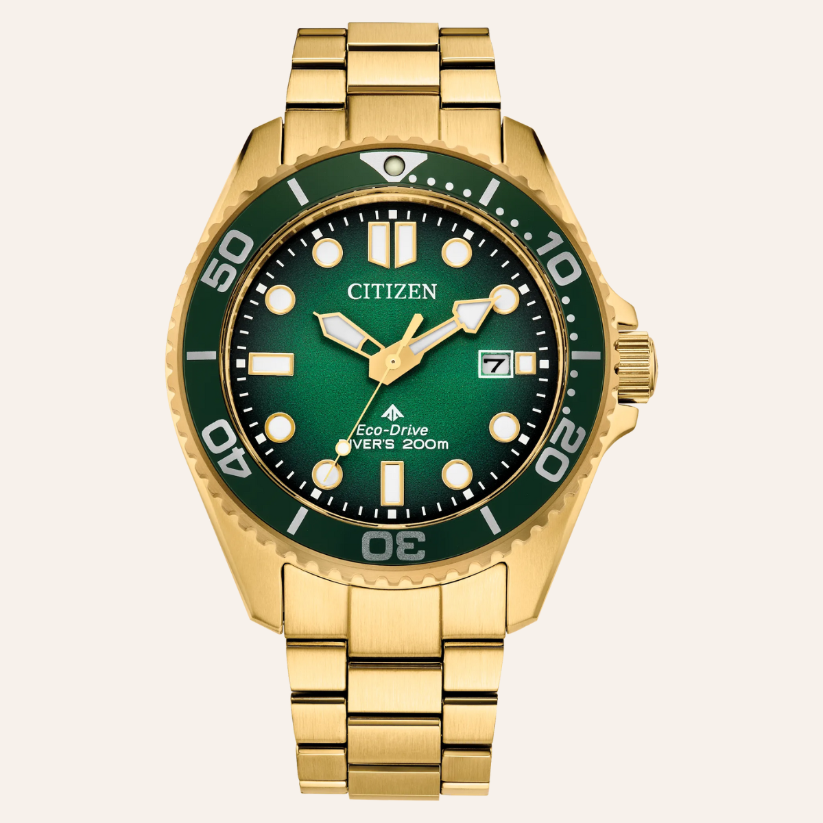 Good looks meet dive-ready functionality in the latest Promaster Dive timepiece. Comfortable on the wrist at 41mm in gold-tone stainless steel, this handsome tool watch is secured to the wrist via a matching triple-link bracelet.